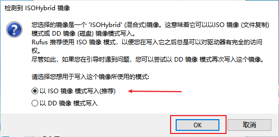 选择 「以 ISO 镜像 模式写入(推荐)」,单击「OK」进行下一步。