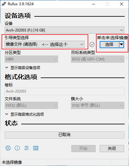 在「引导类型选择」下选择 「镜像文件(请选择)」,然后单击右侧的「选择」来选择你下载好的镜像。